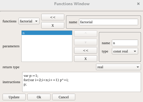 The parameter is added in the list of the parameters of the function by clicking on the << button. To remove a parameter from the list of parameters of the function, click on the X button. To change the order of the parameters, click on the ^ or v buttons in order to move up or down the selected parameter. Select the return type (real or string) in the combo box (5). The return value is either the value of the evaluation of the last expression or the value returned by the keyword return for example return [3.];. Note that, as it is impossible to allocate a variable, when the return type is a string, the string variable with name result is the return string variable.It needs not to be returned. The list of instructions (field marked 6) must be separated by a ; character. For an exhaustive list of the available instructions, see the math parser section. For example to define a new factorial function, see the following window: