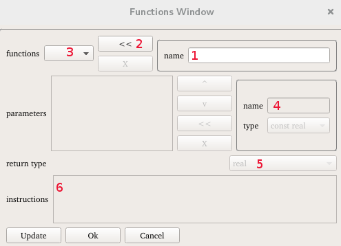 The first action to do is to set the name (field marked (1)) of a function which is a list of characters without blanks, for example : factorial. Then, add the function in the functions environment by clicking on button (2). The function name appears in the functions list (3). Select it. The second step consists in defining the arguments of the function which is a list of parameters. A parameter is a variable with a name (field marked 4) which is a list of characters without blanks and a type which can be either:
