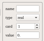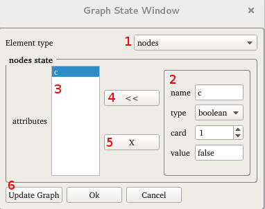 the available type of the variables are real, integer, boolean and string ( A string is a list of words between quotes). To add the variable or to update the properties of the selected attribute, clicked on the "<<" button (box (4)). The attribute appears in the list box next to attributes (3). To delete the selected attribute name, click on the X button (5). To update the state of the graph, click of the Update Graph button (6). To close the window without saving the graph state, click on the cancel button. |