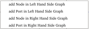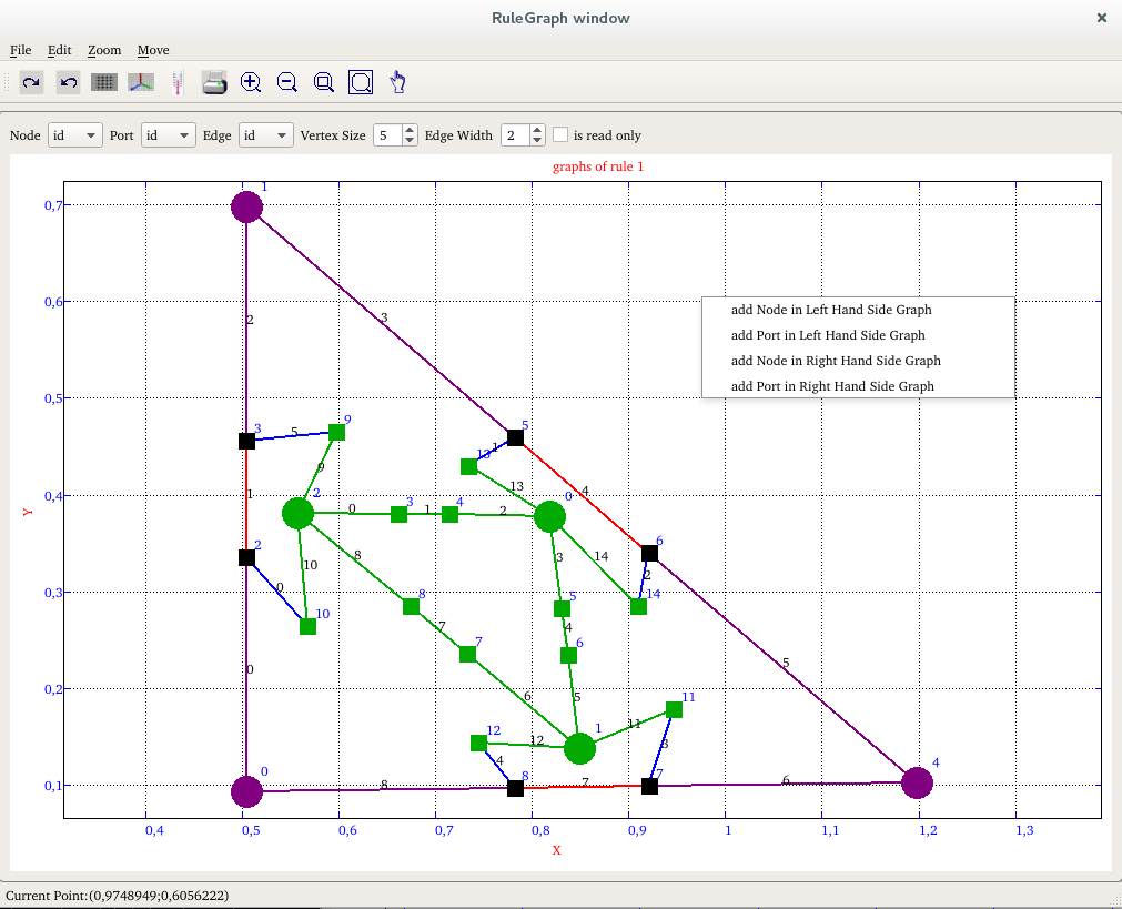 ![]() To add a vertex ( a node or a port) , put the mouse's pointer on the point on the drawing area where you want to create the vertex and click on the right button of the mouse to make appear the popup menu: ![]() Select the wanted item to add a vertex either in the left-hand side or in the right-hand side of the rule. Note that the two parts of the rule are defined in a single frame. The nodes and ports of the environment part which occurs in both the right and the left hand sides are considered as parts of the left-hand side with a specific label (see below for further explanations). All vertices have an Id which are defined automatically by GPaR. If a vertex of Id i belongs to the left-hand side, its label will be P_i, whereas if a vertex of Id i belongs to the right-hand side, its label will be T_i. To create an edge between two vertices, put the mouse's pointer on one of the two vertices and click on the right button of the mouse to make appear the popup menu : ![]() Select the wanted item and maintain the button pushed.