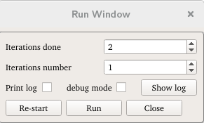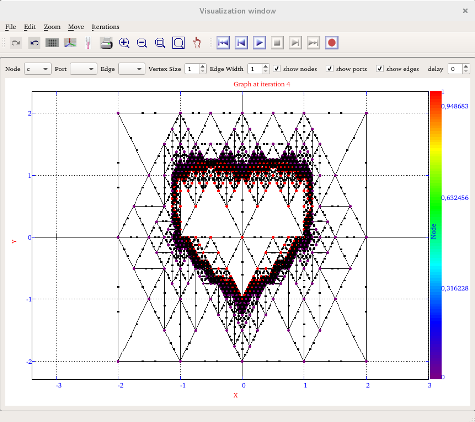 The initial value of the state of the graph's element can be setting by double clicked on the graph element. Its graph element window appears and it is easy to set the value of the attributes of the state. Here, we see in red the nodes whose the c attribute is true and in purple, the nodes whose c attribute is false. It is possible to show the value of the state of a graph element (node, port or edge) by selecting the corresponding state we want to show. Here we have selected the c attribute of node, the id of ports and edges. For more explanations on this window, see the graph managment section. The parallel application of a set of rules rewrite an initial graph named g0 into a new graph named g1 in one step. In the example of mesh refinement, several parallel iterations are needed in order to obtain a precise approximation of the implicit curve of f(x,y)=0. At the second iteration, g1 is rewritten into g2, etc) To perform the parallel graph rewriting process on the initial graph, click on the execute ![]()