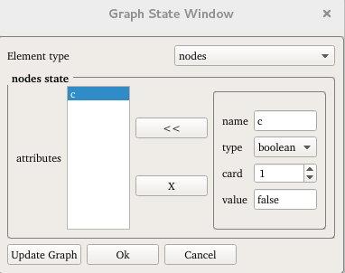 In this window, select the graph element type whose state has to be defined and set the name, type, cardinality and default value of the new attribute. By default, positions of ports and nodes are already defined as attributes. Thus, in our example, we only have to add the node attribute c. The boxes have been filled in the following way :