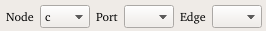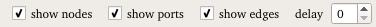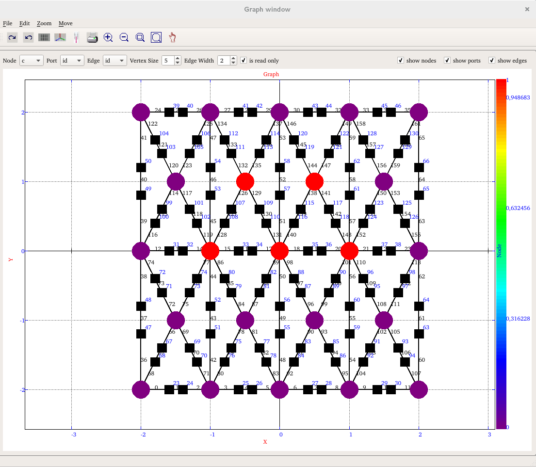 Graphically, the nodes are represented by dotes and the ports by squares. The size of those objects can be modified by using the menu panel under the tool bar. The color of the left-hand side is purple but again, this specification can be modified in the preference menu.