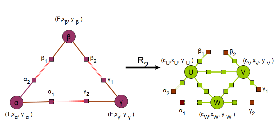 In this drawing, big dots correspond to nodes and squares correspond to ports. The purple parts correspond to the environment parts. They allow to reconnect the new parts (in green) in the rewriting graph. The red parts correspond to the cut components. The environment part of the right-hand side must be included in the environment part of the left-hand side. It corresponds to the part needed to reconnect the new part in the rewritten graph. The environment part of the right-hand side cannot be removed by the action of an other rule, whereas the environment part of the left-hand side can be removed by the action of an other rule. In these specific example, nodes α, β and γ of the left-hand side are useful to compute the attributes of the new nodes U, V and W. For both rules : xU= (xα+xβ)/2, yU= (yα+yβ)/2, cU==(f(xU,yW) ≤ 0). xV= (xγ+xβ)/2, yV= (yγ+yβ)/2, cV==(f(xV,yV) ≤ 0), xW= (xα+xγ)/2, yW= (yα+yγ)/2, cW==(f(xW,yW) ≤ 0). Step by step, we will see how this problem can be modeled and implemented in GPaR. Successively, we will fill in