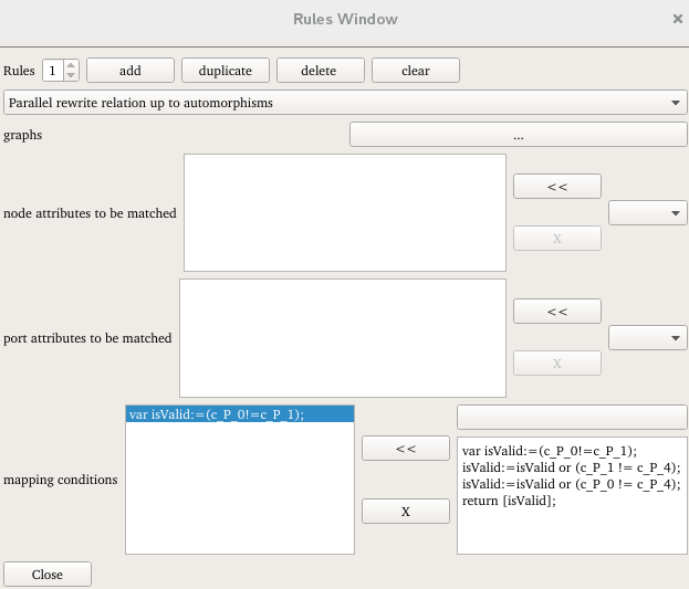 T_0 is the point of the new part with id 0, T_0[i] is the i-coordinate value of the point. To set the coordinates of T_0, select T_0 on the combo box selection after trigger action, and set the point to the middle of segment [P_1,P_4], translated as follow: return [0.5*(P_1+P_4)]; For more explanations on setting rules on state of window see the state managment subsection. For more explanations on the syntax of algebraic formula, see the math formula parser subsection. Proceed in the same way for the nodes T_1 and T_2. Remark that the state of the vertices of the left-hand side can also be modified. In this case the compatibility of the state vertices is checked during the reconstruction of the rewritten graph. If a attribute vertex has 2 different values, a error message appear. Having decided on the rule and the states of new elements, we must decide the conditions of matches. This has to be done in the Rules Window.