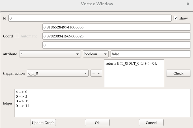 To connect the purple graph with the green graph which corresponds to the new part of the right-hand side of the rewriting rule, the edges (T_9,P_3), (T_10,P_2), (T_11,P_7), (T_12,P_8), (T_13,P_5), (T_14,P_6) have to be added. For instance, the coordinates of the node T_0 must be at the middle of the segment [P_1,P_4] : put the mouse pointer on the node T_0 and select the edit vertex after clicking on the right button of the mouse to make appear the popup menu or click twice on the node T_0. The following window appears:
